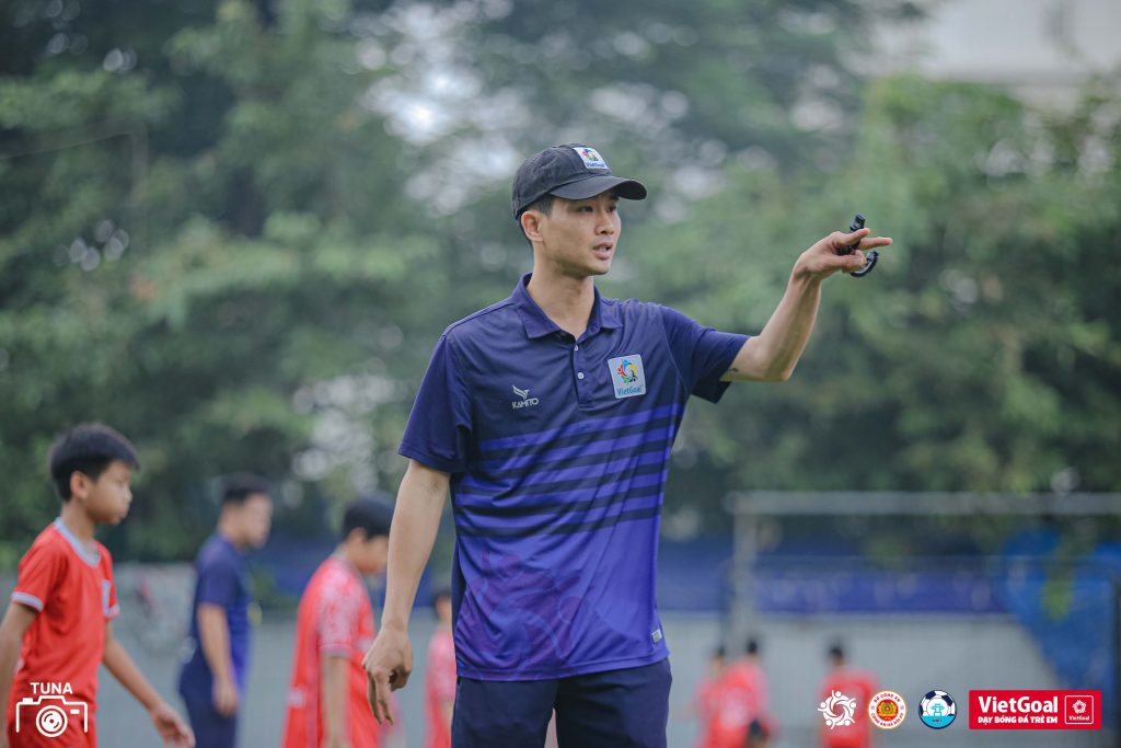 Đến phần tập kỹ thuật, hai thầy như chơi vai đối lập hoàn hảo: thầy Hòa chạy khắp sân cổ vũ, hô to “Tốt lắm con!”, còn thầy Hưng đi sau, lặng lẽ chỉnh từng động tác, tay đặt nhẹ lên vai học trò rồi nói: “Đá bóng phải tinh, không phải nhanh.”