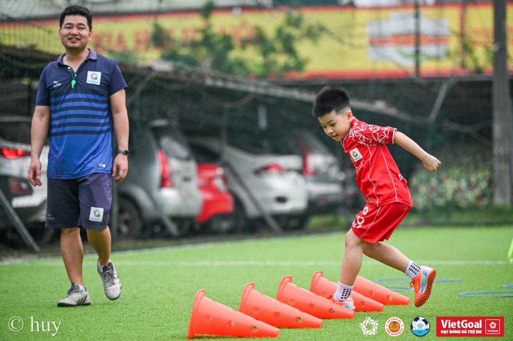Sau phần khởi động, các cầu thủ nhí nhanh chóng bước vào chuỗi bài tập chạy tăng tốc, đổi hướng và di chuyển theo tín hiệu. HLV sắp xếp marker thành nhiều hình dạng như đường zíc zắc, vòng tròn và các đoạn chạy ngắn liên tiếp. Mỗi lượt thực hiện yêu cầu cầu thủ phải giữ nhịp thở ổn định, bước chạy dứt khoát và hoàn thành quãng đường trong thời gian quy định. Tiếng bước chân dồn dập cùng những lời cổ vũ vang lên khiến bầu không khí trên sân luôn sôi nổi.