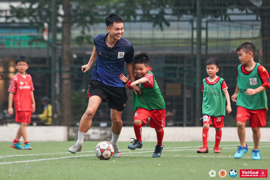 Chiều ngày 11/04, sân VietGoal Hà Trì lại rộn ràng tiếng cười đùa và tiếng reo hò cổ vũ. Không khí buổi tập càng thêm sôi động khi HLV Đào Tuấn Mạnh trực tiếp tham gia vào trận đấu tập của các cầu thủ nhí.