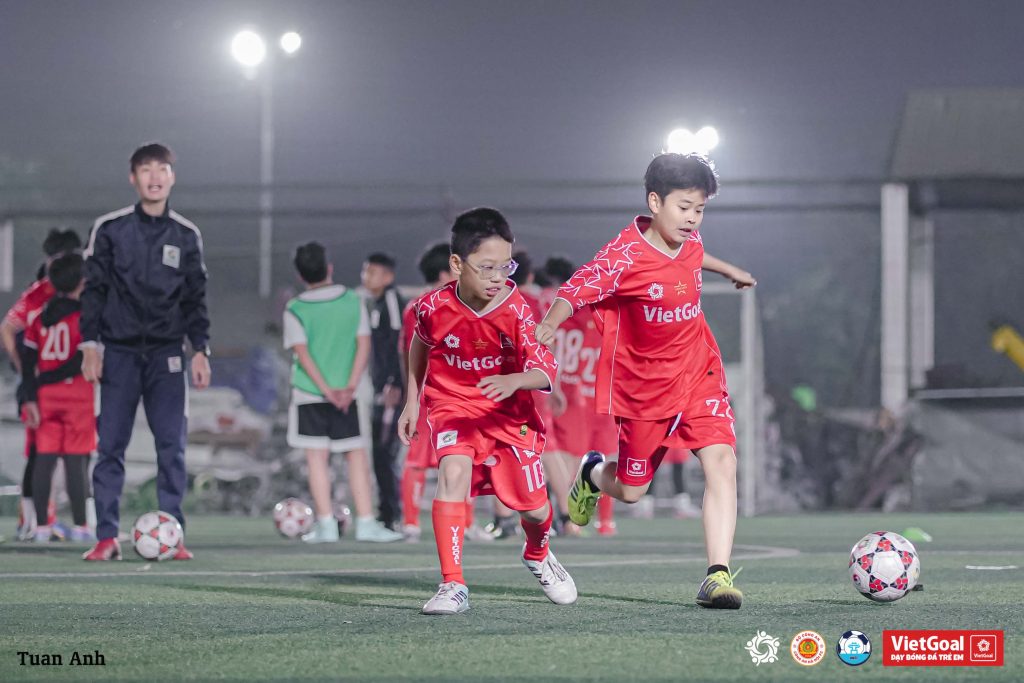 Các thầy quan sát kỹ từng động tác. Khi thấy các em lao vào quá vội, thầy nhắc giữ thăng bằng. Khi thấy có bạn ngại va chạm, thầy động viên mạnh dạn hơn. Bài tập diễn ra liên tục, nhịp độ được đẩy cao dần, từ U7 còn lúng túng đến U11 bắt đầu biết che chắn, xoay người, rồi sút rất gọn.