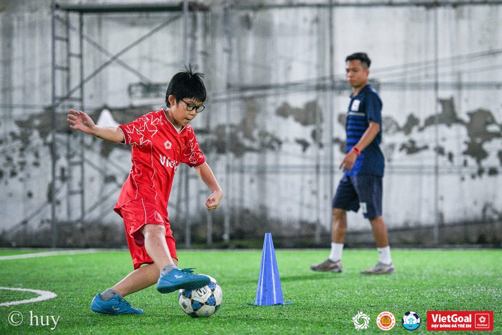 Ở phần tiếp theo, HLV tăng độ khó bằng cách yêu cầu các em dứt điểm sau khi di chuyển tốc độ cao. Cầu thủ nhí phải vừa bứt tốc, vừa giữ thăng bằng trước khi tung cú sút quyết đoán. Bài tập này giúp các em cải thiện sức mạnh cơ chân và khả năng xử lý bóng trong trạng thái vận động. Nhiều em đã thể hiện sự tiến bộ rõ rệt khi cú sút ngày càng chắc chắn và tự tin hơn.