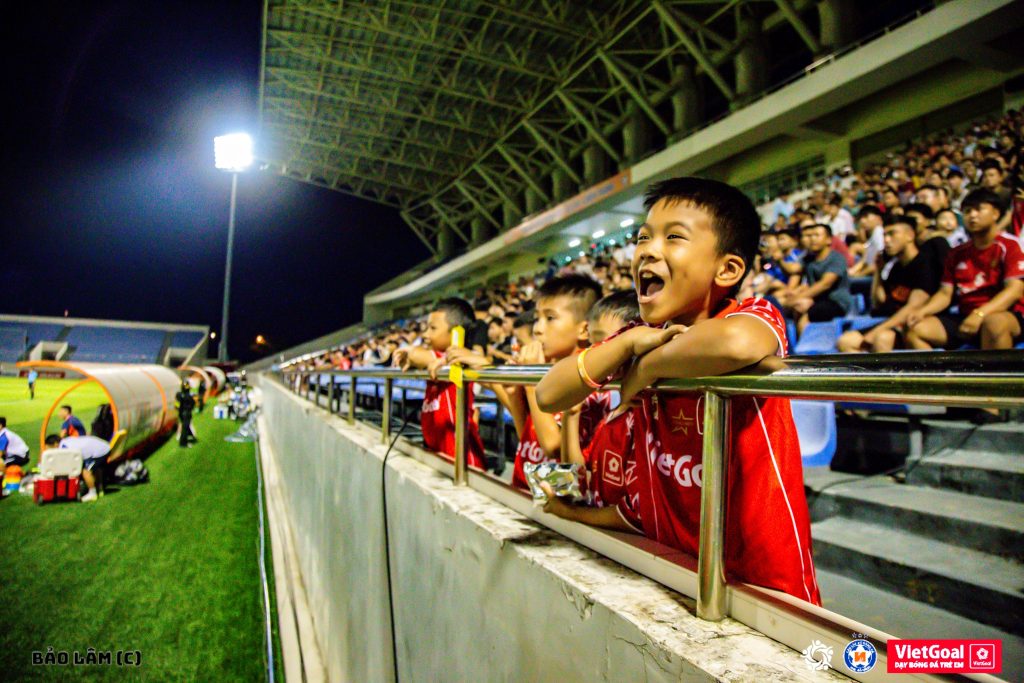 Từ những phút đầu, khán đài rực rỡ sắc đỏ rộn vang tiếng hò reo mỗi khi đội bóng sông Hàn tấn công. Các em nhỏ vốn quen với sân tập VietGoal nay được chứng kiến đội bóng của thành phố quê hương thi đấu thật sự, cảm nhận nhịp bóng chuyên nghiệp và tinh thần chiến đấu không ngừng nghỉ trên sân cỏ.