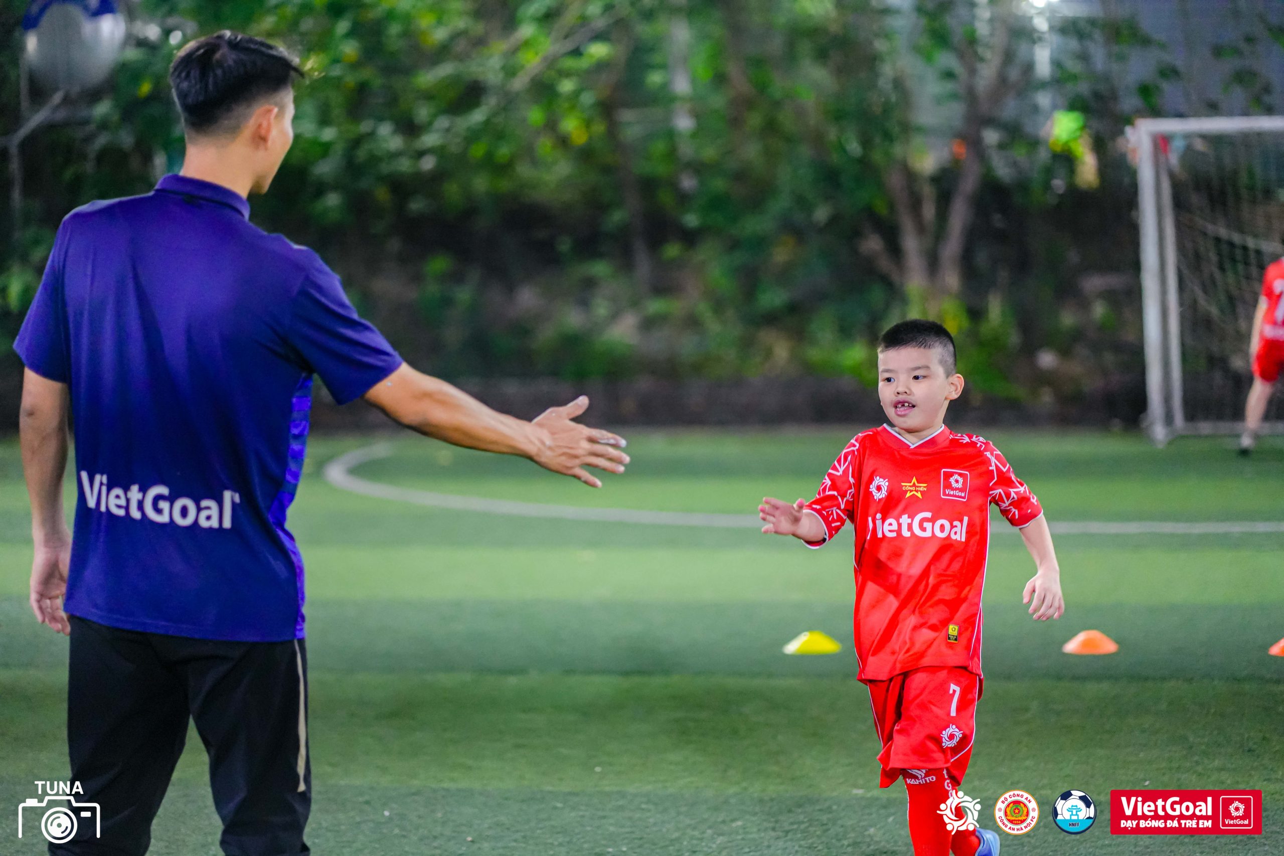 Buổi tập đang diễn ra bình thường thì đến phần thi đấu. Bóng vừa được đưa vào, Khải lập tức lao theo như thể sợ chậm một nhịp là mất cơ hội. Có pha hai bạn to hơn đang tranh bóng, Khải vẫn chen vào giữa, chạm được bóng xong ngã lăn ra cỏ, đứng dậy phủi tay rồi… chạy tiếp như chưa có gì xảy ra.