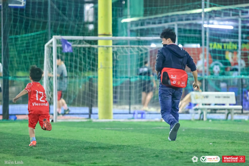 Khôi được bố đưa đến sân từ rất sớm. Em lặng lẽ ngồi nghe HLV hướng dẫn, ánh mắt dõi theo từng động tác. Dù còn nhỏ, Khôi không sợ bóng, không khóc trên sân. Em tập trung, làm từng bài tập chậm rãi nhưng nghiêm túc, như thể đã quen với nhịp sân cỏ từ lâu.