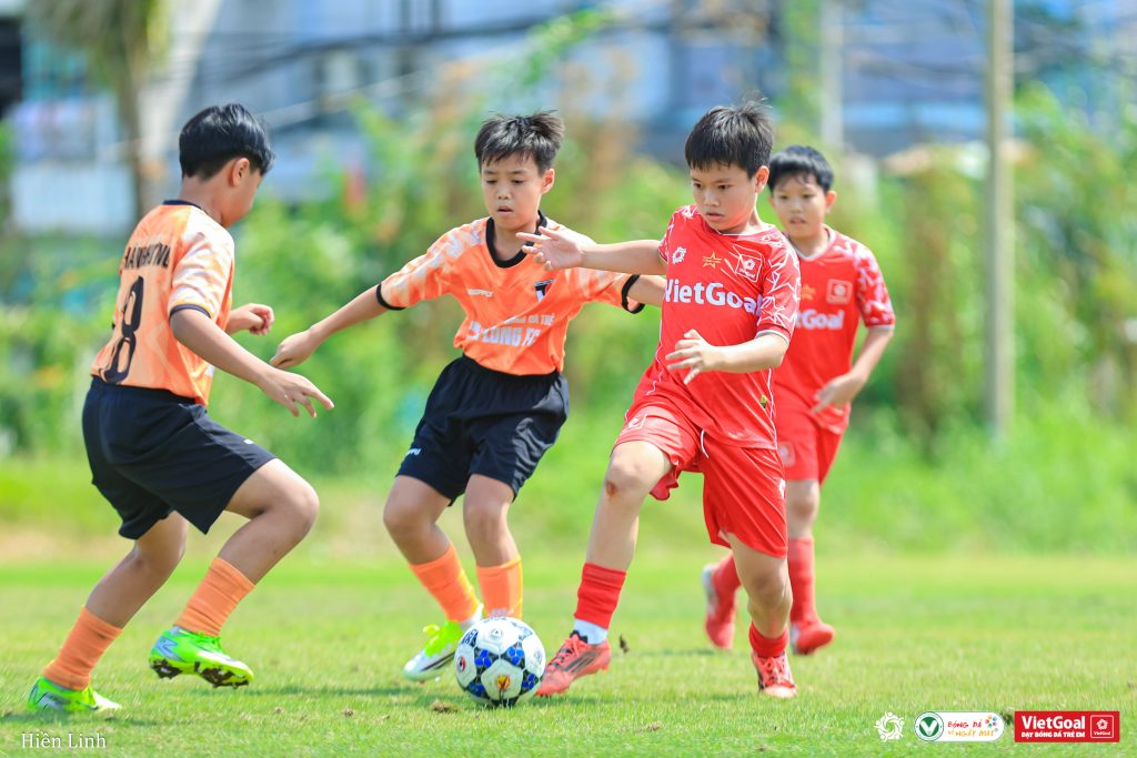 Dù gặp đối thủ với lợi thế sân nhà và tập luyện lâu trên sân 11, U13 VietGoal vẫn giữu vững tinh thần thi đấu. Ảnh: Hiền Linh
