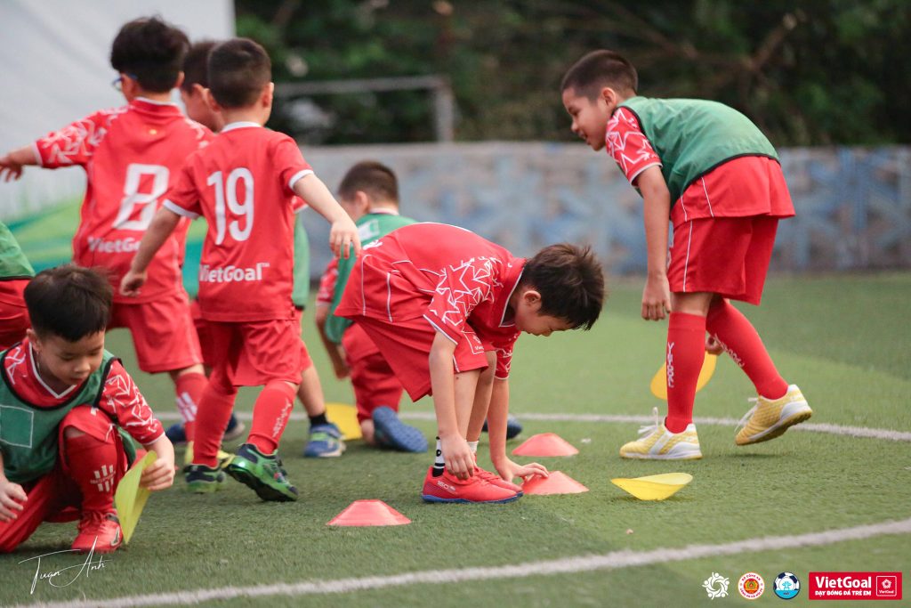 Các học viên được chia thành hai đội, những chiếc marker hai màu được đặt ngay giữa sân. Khi có hiệu lệnh, các cầu thủ nhí ào lên từ cuối sân, chạy thật nhanh để lật các marker. Sự gay cấn thể hiện rõ trên từng bước chạy, từng động tác lật, tạo nên một cuộc đua tốc độ đầy kịch tính.